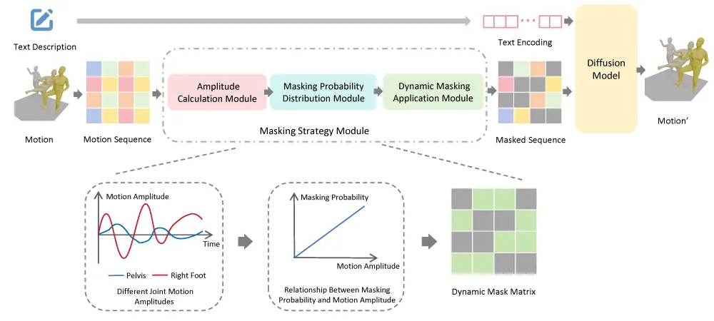 This paper proposes a dynamic masking strategy (DMS) that integrates both motion amplitude and the time dimension. The method introduces a motion amplitude computation module and a dynamic masking allocation mechanism, enhancing the model’s ability to adaptively adjust joint motion amplitude and temporal characteristics in human motion generation. This approach effectively overcomes the limitations of traditional methods in generating complex dynamic motions.